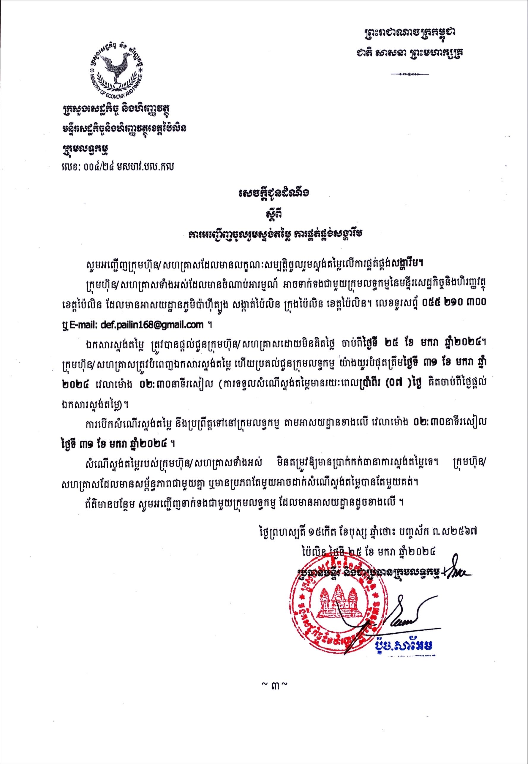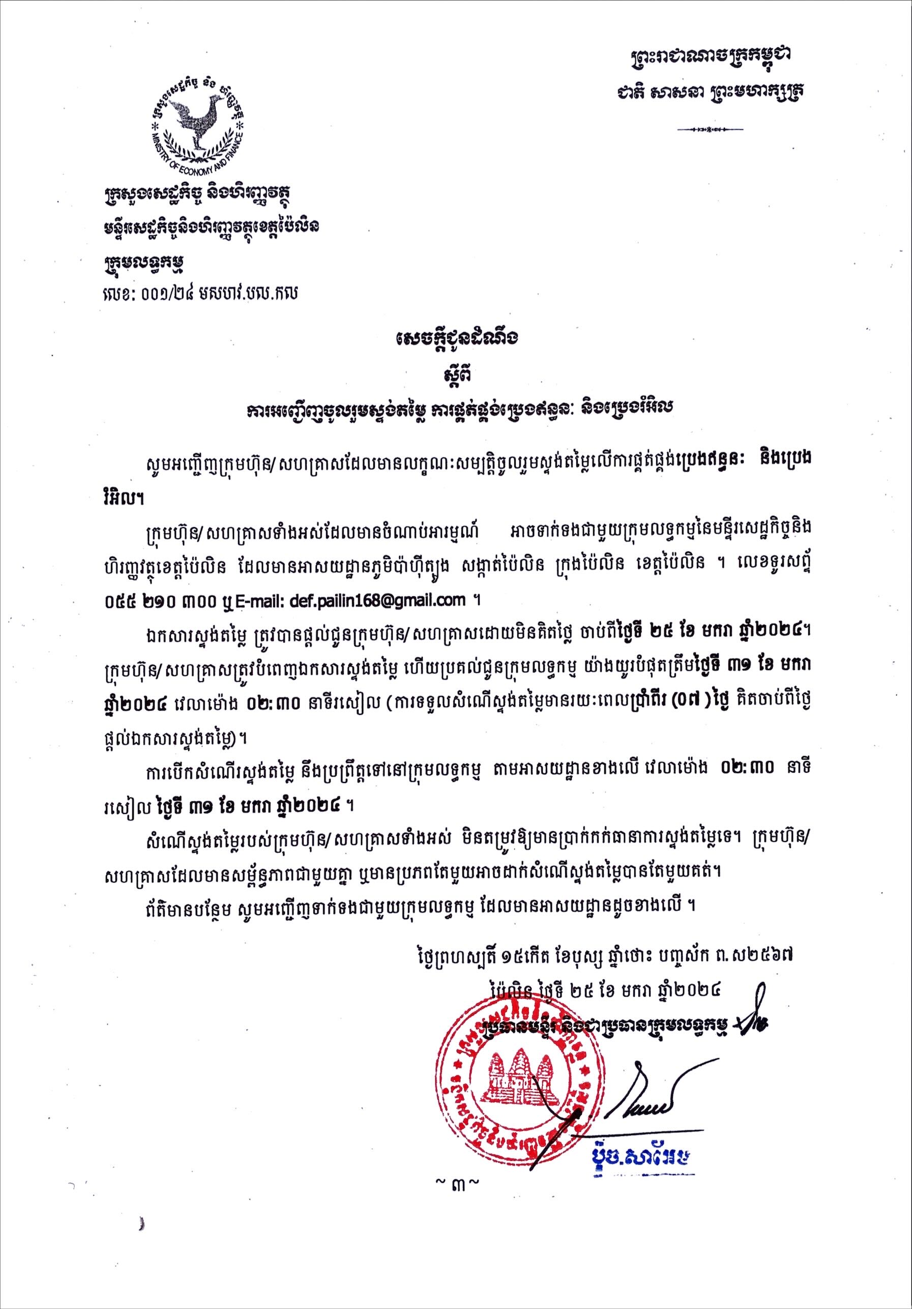សេចក្តីជូនដំណឹងស្តីពីការអញ្ជើញចូលរួមស្ទង់តម្លៃ នៅមន្ទីរសេដ្ឋកិច្ចនិងហិរញ្ញវត្ថុខេត្តប៉ៃលិន