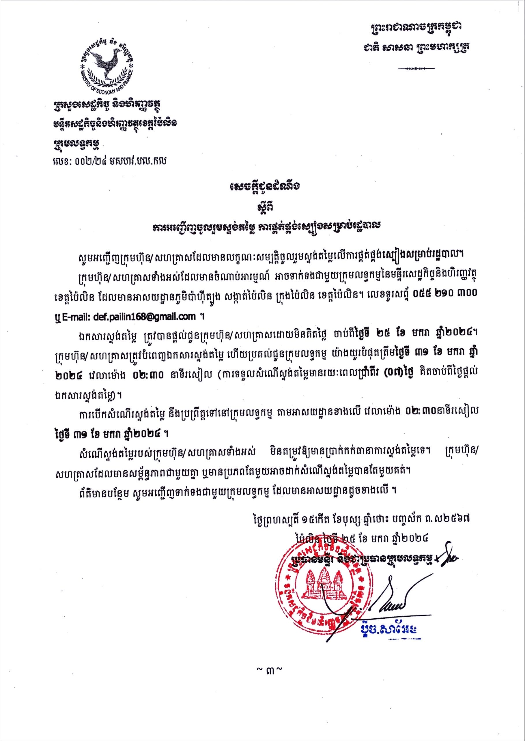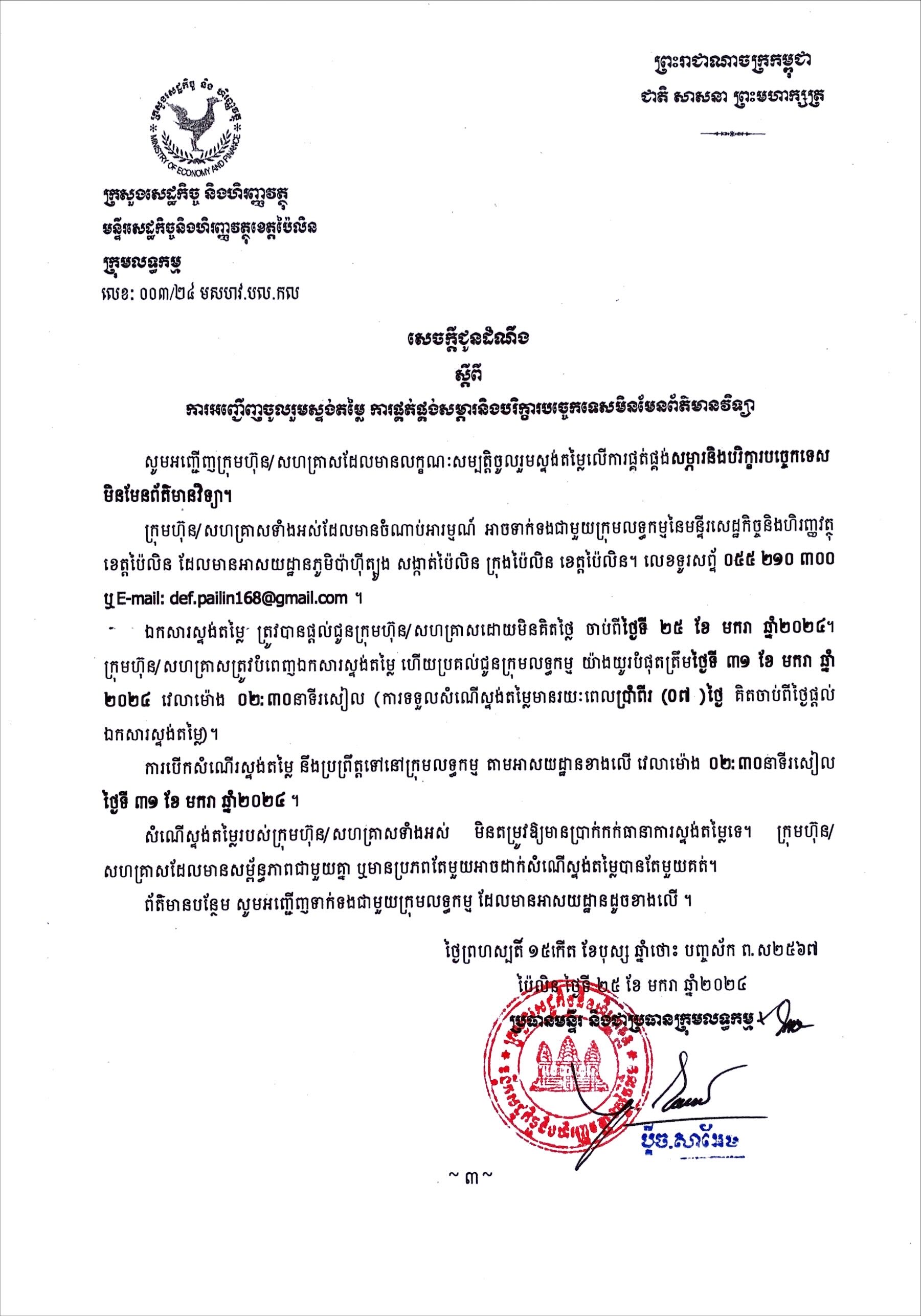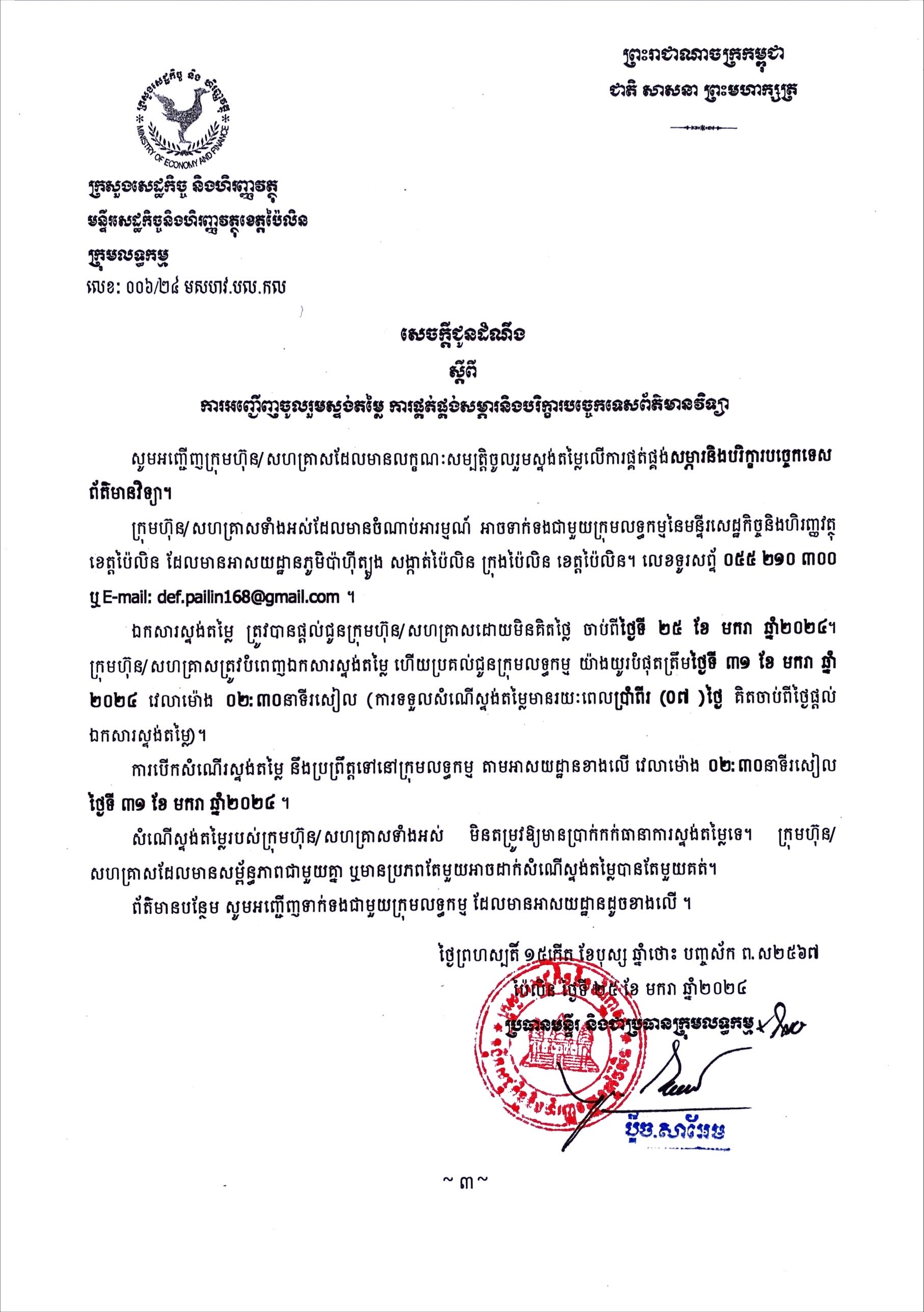 សេចក្តីជូនដំណឹងស្តីពីការអញ្ជើញចូលរួមស្ទង់តម្លៃ ក្រុមហ៊ុន ឬសហគ្រាសទាំងអស់ដែលមានចំណាប់អារម្មណ៍ អាចទាក់ទងជាមួយក្រុមលទ្ធកម្មនៃមន្ទីរសេដ្ឋកិច្ចនិងហិរញ្ញវត្ថុខេត្តប៉ៃលិន តាមរយៈលេខទូរស័ព្ទ ០៥៥ ២១០ ៣០០។